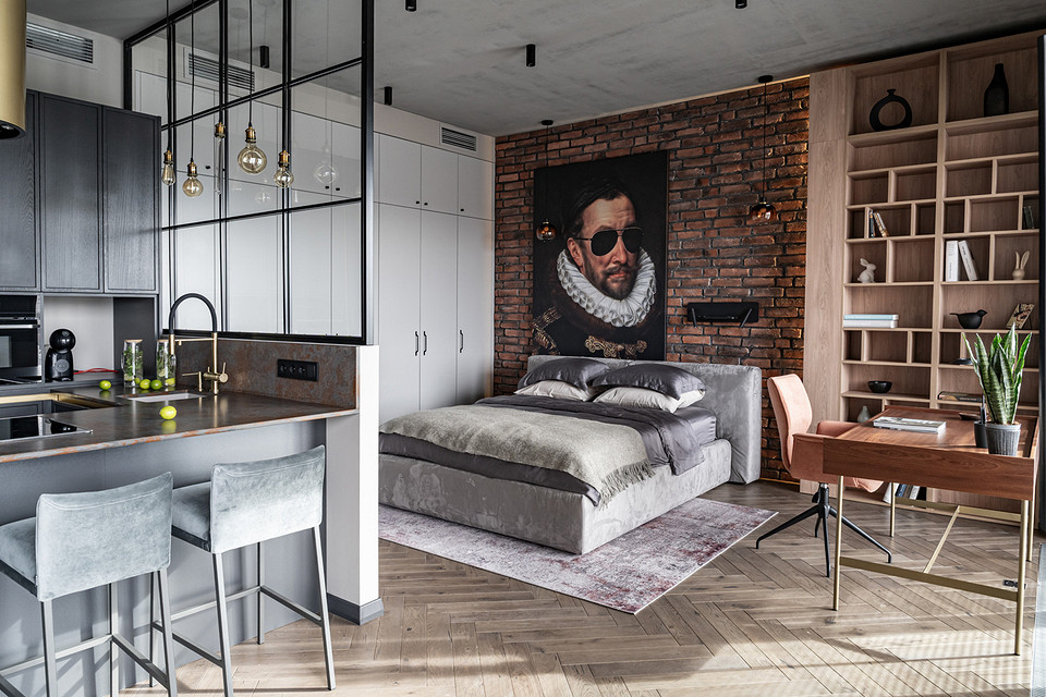 Основные функциональные задачи, которые требовалось решить, заказчик озвучил так: нужны удобная кухня для кулинарных экспериментов, места для хранения книг, удобный диван — чтобы «валяться, читать, смотреть в окно, размышлять», компактное рабочее место, широкая кровать, ванна. При этом важно было сохранить в интерьере легкость и визуальный простор.